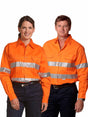 The Australian Industrial Wear Unisex Hi-Vis Cotton Drill Long Sleeve Shirt With Taping is available in orange in a large range of sizes.