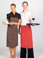 The Ramo Full Bib Striped Apron is a full bib apron that is constructed from a cotton and polyester blend and features a classic striped design and front pocket.