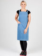 The Ramo Full Length Denim Apron is constructed from a cotton and polyester denim blend and features a kangaroo pocket and "X" shape strap stick with brass buckles.