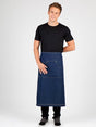 The Ramo Long Waist Denim Apron is constructed from a cotton and polyester denim blend and features a kangaroo pocket and "X" shape strap stick with brass buckles.